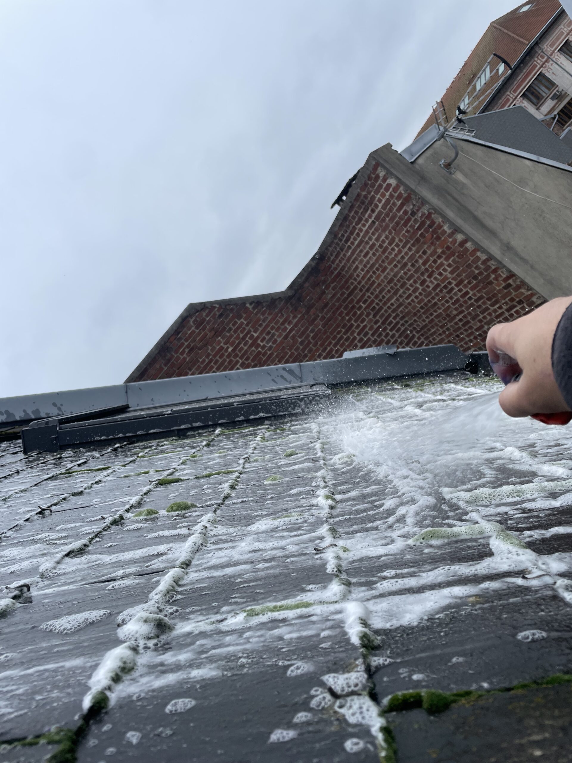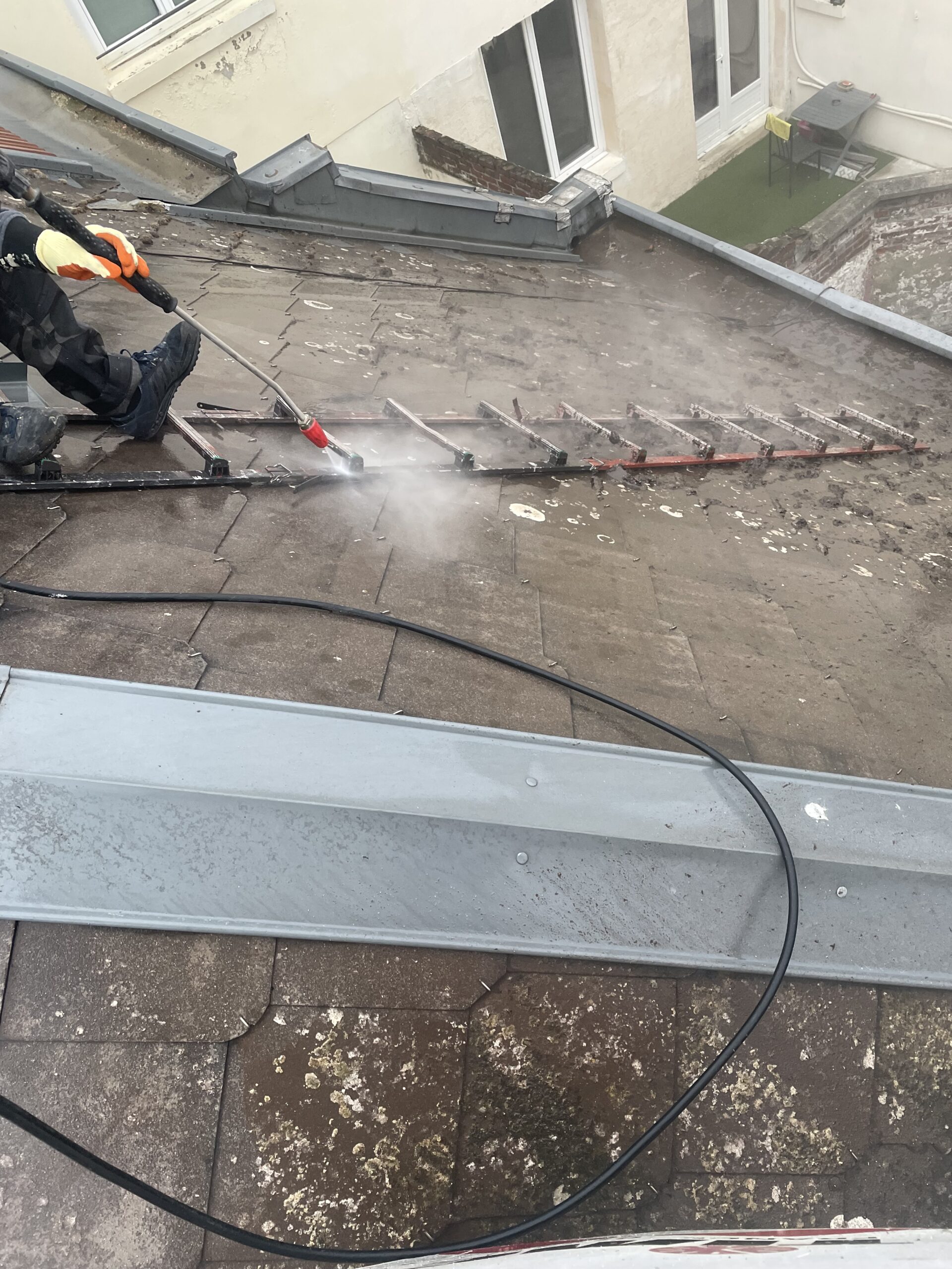 - Préparation de la toiture et mise en place matériel : échelles, nacelle, Karcher, brosses …